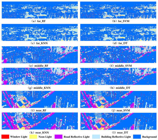 Based on the segmentation, four classification algorithms, RF, SVM, KNN and DT, were used to classify the lighting objects, and the classification results are shown in Figure 6. In general, RF had the best classification results, and its classification results reflected the distribution of various types of urban lights more accurately; in particular, the window lights and backgrounds in the near, middle and far view regions are perfectly identified. The classification results of SVM and DT were the second best, and the two types of algorithms classified window light and building reflective light better; but, compared with RF, the SVM algorithm had more sticky recognition phenomena of identifying neon light periphery as window light in the mid- and far-view regions, there was the phenomenon of identifying multiple window lights as one window light, and more misclassification of road reflective light in the near- and mid-view regions. DT had more misdistribution of window light and road reflective light than RF. The KNN had the worst classification results, with a particularly high number of misclassifications and sticky recognition phenomena, especially for road and building reflective lights.