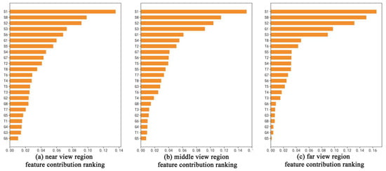 To further explore which specific features had the greatest degree of influence on the fine classification of nighttime urban lighting, the RF algorithm was used to obtain the ranking of feature contributions in different regions (Figure 7). Among the three regions, the feature with the highest contribution was the spectral feature, and the total contribution of the spectral feature was 59.63% in the near view region, 63.49% in the middle view region and 66.09% in the far view region; the proportion of the region increased gradually from near to far, indicating that the smaller the classification object was, the higher the contribution of the spectral feature was. Among them, Mean_Red (S1), Mean_Green (S2) and Brightness (S8) account for the top three of the three regional features, accounting for 32.19%, 36.92% and 44.34% from near to far, respectively, indicating that the cities are more sensitive to the red and green bands at night compared with the blue band. The contribution of geometric features was the smallest, 17.43% in the near view region, 14.77% in the middle view region and 14.67% in the far view region, and the contribution decreased gradually from near to far, indicating that the smaller the classification object was, the smaller the proportion of geometric features was, and the same went for textural features. It can be seen that the contribution of spectral features was the largest and the contribution of geometric features was the smallest in the nighttime urban lighting images captured by UAVs, and the smaller the classification object was, the larger the contribution of spectral features was, while the contribution of geometric and textural features was smaller.