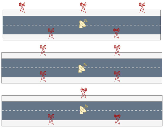 According to the literature, 5G base stations were introduced in each scenario at roadside on both sides of the street at an equal spacing of 200 m. Their heights were set to 20 m. The simulation was carried out by testing three possible 5G network configurations differentiated by the number and geometries of the base stations around the observer. The networks are represented in Figure 2: