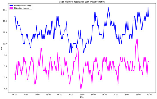 The analysis of the satellites’ visibility confirmed what was expected: the presence of buildings caused a clear degradation of the satellites’ configuration (Table 4 and Figure 3 and Figure 4). In the residential streets, a general decrease in the number of visible satellites was observed, and the NS street provided worse statistics than the EW one. In any case, all the epochs provided at least four visible satellites, which was the minimal condition to estimate the positions.