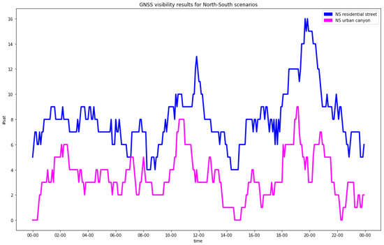 GNSS visibility for north-south streets (blue = RA; pink = UC).