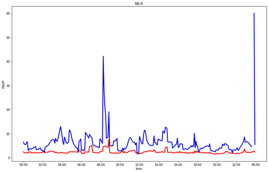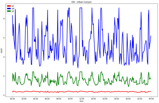 The last tested network contained three staggered base stations around the observer. This solution can represent the typical low-coverage urban environment network well. In epochs with no or one in-view satellite, the PDOP could not be computed, and the positions could not be estimated. Table 10 and Table 11 report the obtained results for urban canyons and residential streets, respectively. Despite the missing epochs with less than two satellites, the results were fair. In any case, some epochs with very poor GNSS geometries still presented high PDOP values. In addition, the results became worse for the north-south street direction, as previously noticed.