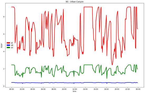 In addition, for the hydrid GNSS and 5G configuration, the individual analysis of the indexes in the local east, north and up coordinates were performed. In this case, the worst estimable coordinate was also the horizontal one orthogonal to the direction of the street. As an example, the results of the EW and NS urban canyons with the C5N5-CG-TDoA signal configuration are shown in Figure 9 and Figure 10, respectively.