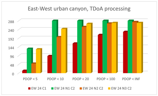Figure 11 and Figure 12 show histogram charts of the number of epochs classified by the criteria presented in Table 3: a PDOP value smaller than 5, 10, 20, 100 or ∞.