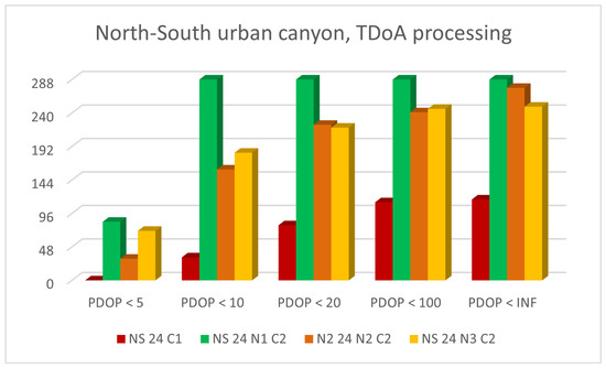 Number of epochs whit PDOP values smaller than 5, 10, 20, 100 or ∞ for north-south urban canyon with CG, N5-CG-TDoA, N4-CG-TDoA and N3-CG-ToA signal configurations.