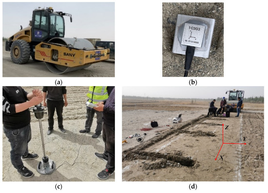 Test site and test equipment. (a) Vibratory roller. (b) Accelerator sensor. (c) Plate load test. (d) Test site.