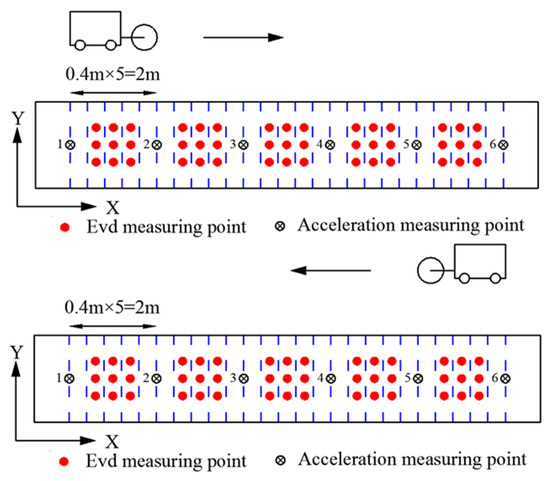 - Six acceleration measuring points are arranged on the ground with a distance of 2 m between adjacent measuring points to collect the acceleration response of the filling. The field between adjacent measuring points is divided into 5 sections on average, with each section having a width of 0.4 m. As shown in Figure 3, select the middle three sections for the Evd test, and three tests are conducted on each section.