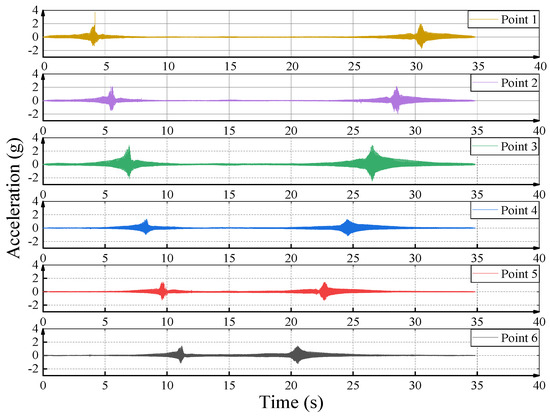 In the working process of the vibratory roller, the vibratory roller not only has an impact on the vibrating wheel and the working area under it but also has a certain impact on the surrounding filling soil. In this paper, the propagation law of vibration wave along the traveling direction is analyzed by taking the peak acceleration of each acceleration measuring point as the research object. Figure 5 shows the acceleration time−history curve of a compaction process. According to the analysis, the effective vibration process is about 35 s. The vibratory roller first goes through measuring point 1, then passes through measuring points 2, 3, 4, and 5 in sequence, and finally to measuring point 6. Then it returns from point 6 to point 1 to complete a set of vibrating compaction tests.