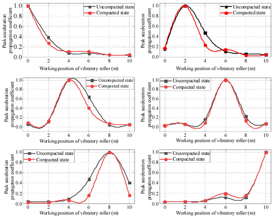 From the analysis of Figure 7, it can be seen that no matter which working position the vibratory roller is in, the peak acceleration of the soil uncompacted is greater than that in the compacted state. The maximum value of the peak acceleration difference occurs at the working position of the vibratory roller, and the adjacent position is second. As can be shown in Figure 8, when the vibratory roller is running directly above each measuring point, the propagation coefficient of peak acceleration in the uncompacted state is greater than that in the compacted state of adjacent measuring points along the driving direction. The main reason for this phenomenon is that in the test area where the filling has been rolled, the upper soil and the lower soil are tightly bonded together, in a relatively dense state, which has a greater restriction on the sensor, making the sensor can be better embedded in the soil and vibrate together with the soil. The uncompacted soil is relatively fluffy, and the upper soil is not tightly bonded to the lower soil, which has a less restrictive effect on the sensor and enables the sensor to receive greater vibration energy.