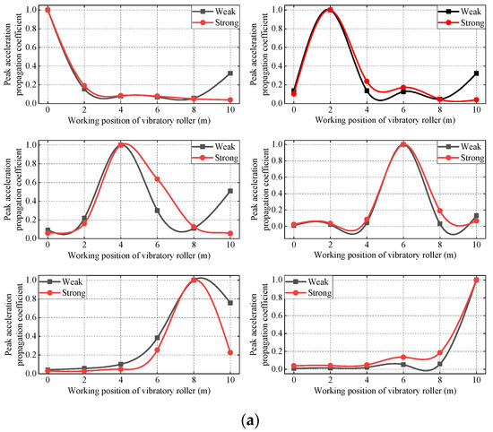 Propagation coefficient of peak acceleration under different amplitudes of vibratory roller. (a) Propagation coefficient of peak acceleration under uncompacted state. (b) Propagation coefficient of peak acceleration under compacted state.