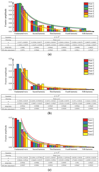 From the analysis of Figure 12, it can be seen that the relation between the amplitudes of fundamental waves and multiple harmonic waves is nonlinear, fitting y = a·xb, and the specific parameters of the fitting results a and b can also be seen from the figure, in which the square of the similarity coefficient (R2) of the fitting curves of fundamental waves and harmonic waves of different vibratory roller speeds and different measuring points is at least 0.97, while the rest R2 are above 0.99.