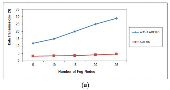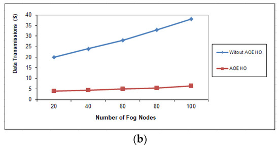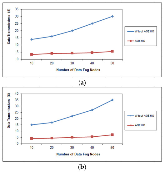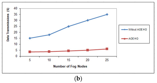 Data transmission between fog nodes = 25 nodes. (a) Size of data replication = 64 MB. (b) Size of data replication = 320 MB.