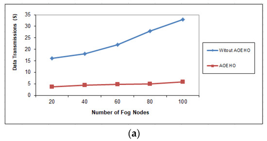 Data transmission between fog nodes = 100 nodes. (a) Size of data replication = 64 MB. (b) Size of data replication = 320 MB.