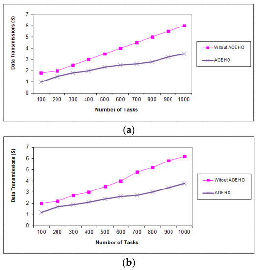 Data transmission between tasks = 1000 tasks. (a) Size of data replication = 64 MB. (b) Size of data replication = 320 MB.