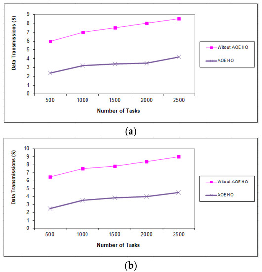 Data transmission between tasks = 2500 tasks. (a) Size of data replication = 64 MB. (b) Size of data replication = 320 MB.