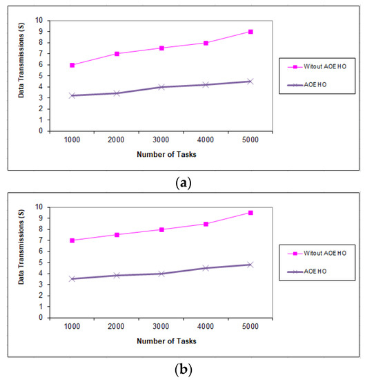 Data transmission between tasks = 5000 tasks. (a) Size of data replication = 64 MB. (b) Size of data replication = 320 MB.