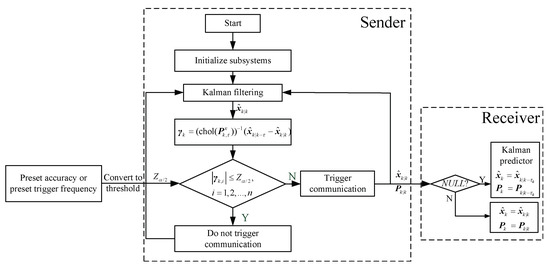 Since indiscriminate filter calculations and trigger judgments of smart nodes are described in Section 2.1, only the algorithm of the receiving center is introduced in this section. In the receiving center, the Kalman filter algorithm based on the event-triggered mechanism (ET-KF) can be expressed as: