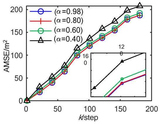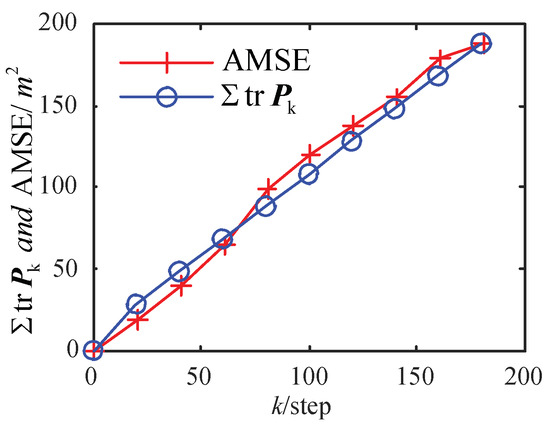 In Figure 2, with a different , the comparison curves of AMSE of ET-KF are shown. It can be seen that the smaller is, the greater the threshold is, the lower the trigger rate is, and the worse the accuracy AMSE is. Comparison curves between the theoretical approximate estimation accuracy (the sum of trace of ) calculated by (33) and the AMSE obtained by the experiment with are shown in Figure 3. It can be seen that the theoretical estimation accuracy is close to the AMSE obtained by the experiment, which verifies the correctness of Theorem 2 under the time-varying situation. The AMSEs in Figure 2 and Figure 3 rise in a straight line, which means that the corresponding MSEs are stable.