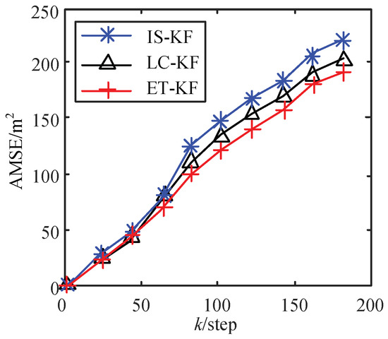 In Table 4 and Figure 4, ET-KF is compared with the event trigger of innovation standardization (IS-KF) [14], a dynamic event trigger constructed by the linear change in the rate of change (LC-KF) [22]. From Table 4, under the same trigger rate (80%), the (AMSE at step 200) of the proposed trigger mechanism is lower than the other two trigger mechanisms. Figure 4 shows the comparison curve of AMSE at different steps, as the number of steps increases, the AMSE value gap based on different trigger mechanisms becomes larger. Among them, the AMSE value of the ETKF mechanism is the smallest and the estimation accuracy is the highest, which verifies the correctness of the conclusion.