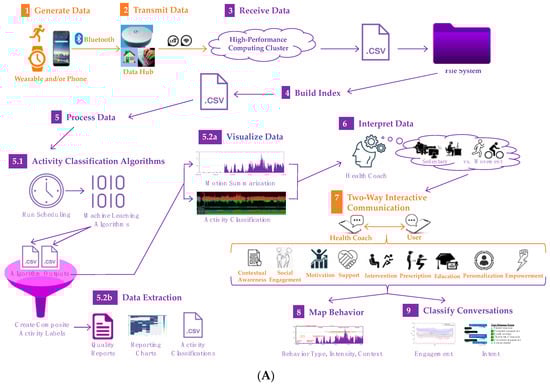Specific to this pilot, Companion will consist of the following components and workflow: (i) continuously worn wireless wrist sensors (i.e., ActiGraph Insight Watch: triaxial accelerometer; ±8 g; 64 Hz) to capture raw motion data twenty-four hours/day. (ii) These data are transmitted via ActiGraph’s wireless data hubs located at participant homes every hour to ActiGraph’s Centrepoint Platform. (iii) Motion data will be extracted from Centrepoint and processed on our backend located on Northeastern University’s high-performance computing cluster. This backend includes signal visualization software (i.e., Signaligner Pro v2.3.10-beta; Signaligner.org) [42], a signal quality control (QC) algorithm to identify anomalous sensor signals [75] that are unrepresentative of human movement, motion summarization algorithms for total activity volume (i.e., MIMS) [40], and activity classification using machine learning algorithms: (a) SWaN (sleep, wear, and non-wear) [44] and (b) MUSS (i.e., multi-site sensing for activity recognition: lying, sitting movement, non-wear, ambulation, and upright movement) [41,43]. The three algorithmic outputs are up sampled to an event resolution of one second and paired with a composite SWaN plus MUSS prediction (Figure 3). Similar and consecutive one second events with the same neighboring predictions and timestamps are combined into single events, resulting in continuously labeled activity classification events of variable duration. Combining the outputs of SWaN and MUSS into a composite prediction will allow us to retain MUSS’ granularity (ambulation vs. sitting movement vs. upright movement) during wear hours, and SWaN’s more accurate and sophisticated classification of sleep vs. non-wear [41,43,44]. (iv) Processed motion summary and raw sensor data will be visualized by a health coach using the backend interface to temporally display the data with overlaid automatically processed behavior labels. This will enable detection of major behavior types (i.e., movement vs. sedentary) (Figure 4). (v) Health coaches will enquire about major automatically detected behaviors (e.g., movement > 10 min; sedentary > 30 min) to determine context (e.g., walk during lunch; in a regular weekly meeting) using interactive two-way communication. (vi) They can also choose to determine behavior context of any other specific automatically detected behavior. (vii) These automated and manual records will incrementally yield a reliable visual model of major habitual and recurring daily behaviors at the backend. Such information will be richer than what was previously available to an interventionist. (viii) Based on the model, and incremental information being received in near-real-time, coaches will engage the participant via personalized text message conversations to intervene and promote prescription component delivery at opportune times (i.e., near-real-time) to help develop routine habits. Back-and-forth exchanges may or may not be instantaneous, as in asynchronous text messaging conversations (i.e., within a few seconds or minutes). Thus, the Companion will typically respond to certain activities or participant inquiries within minutes, which will maintain the contextual saliency of any information exchange and allow for a just-in-time adaptive intervention. Figure 4 depicts Companion’s personalized and interactive two-way communication, behavior mapping of typical behaviors with motion data and context, and algorithmic activity type classification; data depicted were generated during the pre-study testing phase.