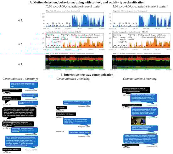 Companion’s personalized and interactive two-way communication, behavior mapping with motion data and context, and activity type classification. (A) Health coaches first detect major behaviors (i.e., movement [M] vs. sedentary [S]) by visualizing periods of whole-body locomotion (i.e., steps) on the ActiGraph Centrepoint platform (A.1.). This knowledge is used in conjunction with overall wrist motion summary data (MIMS) to further identify periods of non-locomotion movement (A.2.), e.g., MIMS helps health coaches identify if periods inferred as sedentary during whole-body locomotion visualization (A.1.) are truly sedentary or may involve other types of non-locomotion physical activity. Raw actigraphy data are then processed and visualized on the backend using validated machine learning activity recognition algorithms to classify the signal into selected activity types and non-wear. Such a three-pass data processing and signal visualization strategy yields a reasonable understanding of when an older adult is active and sedentary (A.3.). (B) Health coaches use interactive two-way text-based communication to enquire about the context of major detected behaviors gathered from activity visualizations (A.1., A.2., and A.3.), to further contextualize behavior, and to intervene and promote prescription at opportune times. Three sample conversations at different times of the day (morning, midday, and evening) are depicted here (blue and black boxes indicate Companion’s and the user’s text messages, respectively). Context gathered via text-based communication is overlaid on the backend with periods of sedentariness, locomotion, and other non-locomotion movement to yield a reliable visual model of the context of major behaviors (A.2.). Labels (A.2.) for major behaviors and context are displayed on the lower and upper planes, respectively.