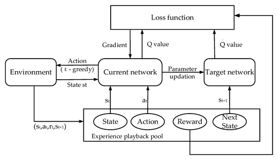 We used the DDQN model [39] to train the mobile device agent to obtain the optimal offloading decision, which could reduce the high computational complexity caused by the state space explosion in the MDP. The DDQN model adopted an experience playback method to decouple the action selection and Q value calculation, where Q is the value of the reward function to take an action. During the training process, the agent maintained an experience playback pool and saved the transfer quads (s, a, r, s’) of each time slot in the experience playback pool. The elements of the transfer quad were the current state, the action, the reward value taking an action under current state, and the next state taking an action, respectively. The agent randomly selected a small batch of samples in the experience playback pool to update the parameters of the network, that is, randomly selected some previous experience to learn. The update of the experience playback pool followed the principle of “first in, first out”. The agent maintained the current network Q(s, a; θ) and the target network (s, a; ), where Q is used to select actions, is used to evaluate the value of the selected action, and θ and represent the parameters of Q and . The target network regularly updated its own parameters using the parameters of the current network, that is, to copy the parameters of the current network. The experience playback method was beneficial to accelerate the training convergence.