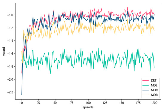 Figure 5 shows the comparison results of the reward with the DRT, MDL, MDO, and MDR strategies during the training process. The ordinate represents the average value of the cumulative reward sum of all MDs per episode. As the number of training episodes increased, the rewards of all strategies tended to converge. DRT achieved the highest reward compared with the other baseline strategies, which meant DRT could learn the best offloading decision with minimal latency for MDs. In the first 50 episodes, the rewards of MDO and MDR increased gradually. This was because both MDO and MDR offloaded tasks to the MEC server for further decision making by the MEC server agent, i.e., the increasing trends reflected the training process of the D3QN-based MEC server agent. The MDO obtained a reward close to that of DRT. This was because when the wireless network was stable for most of the time, it was more conducive for the mobile device agent to offload tasks to the more powerful MEC server to reducing the execution delay of all tasks. Due to the limited computing power of MDs, local computing had a limited effect on reducing the overall task execution delay. For the same reason, the MDL received the lowest reward and the worst task execution delay.