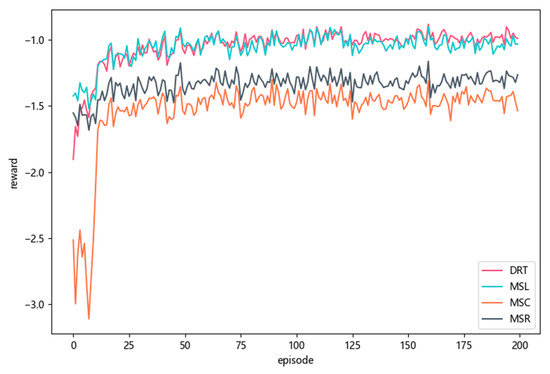 Figure 6 shows the comparison results of the reward with DRT, MSL, MSC, and MSR strategies. The DRT still achieved the highest reward compared with the other baseline strategies, which meant DRT could fully utilize the computing resources of the MEC servers and the central cloud to make the best offloading decision. In the first 25 episodes, the rewards of both MSL, MSC, and MSR increased gradually. The reason was that the DDQN-based mobile device agent was learning the offloading strategy, which also reflected the convergence performance of the MD agent. The reward obtained by MSL was close to that of DRT. Although DRT considered the computing resources of neighboring MEC servers to offload tasks, these resources were also used by other MEC servers, so the overall improvement was slightly better than MSL. However, compared with MSC and MSR, DRT showed significant performance improvements.