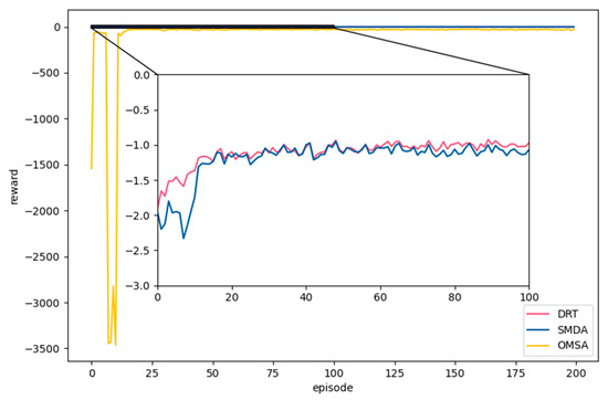 Figure 7 shows the comparison results of the reward with DRT, SMDA, and OMSA during the training process. With the increase in the training episode, both SMDA and OMSA tended to converge, and DRT obtained the highest reward. Compared with SMDA and OMSA, DRT could fully utilize the computing resources of MDs, MEC servers, and the central cloud. The reason for the huge fluctuation of OMSA was that it filled the experience replay pool in the first episode, and the agent already started to learn and update the network parameters in this episode, which caused overfitting. Therefore, when OMSA encountered a large number of states different from previous ones, the learned strategies did not necessarily perform well. When the reward during 0-100 episodes was zoomed in on, it could be observed that SMDA was close to DRT, but DRT converged faster than SMDA and OMSA. This was because SMDA applied FL to achieve decentralized training, which effectively reduced the communication overhead. However, DRT divided the computation offload decision problem into two sub-decision problems, which were respectively solved by the two types of agents. In this way, the state and action space of DRT agent was much smaller than that of SMDA and OMSA. It could not only enable the agent to learn the optimal strategy faster but also reduce unnecessary data transmission between MDs and MEC servers. Since SMDA and OMSA used a single type of agent, they needed to obtain MEC server information or mobile device information, which increased the burden of wireless networks and led to higher decision delay.