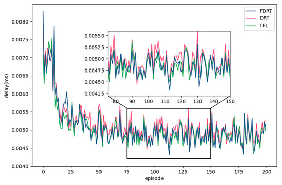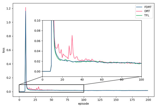 Figure 8 shows the comparison results of the loss with FDRT, DRT, and TFL during the training process. The ordinate denotes the average values of the cumulative loss sum of all mobile device agents in each episode. The loss values were kept at 0 at first and then rose sharply. This was because the experience replay pools of mobile device agents were not full yet, so the agents had not started learning. In addition, FDRT and TFL accelerated the convergence of mobile device agents, and the losses of the three methods were finally stabilized at a certain value. It can be seen from the zoomed in sub-figure that DRT converged at about 60 episodes, while FDRT converged at about 23 episodes, saving 61.7% of the training time for the mobile device agents.