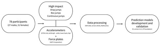 Some questionnaires have been developed in an attempt to capture the bone-stimulating characteristics of specific activities [,]. However, although the scores generated by such subjective methods seem to be related to bone status, this association appears to be limited and inconsistent across studies [,,]. A more robust approach to assess mechanical loading is the use of equipment such as force plates—the gold standard for ground reaction force measurement []. However, the use of force plates is less applicable in some clinical and research settings, as they are immobile and expensive devices that are limited to assessments in laboratory conditions. In the last few years, objective methods based on wearable devices have been proposed as a solution to overcome these limitations, since acceleration and some mechanical loading variables resulting from body movement have shown to be correlated [,]. In fact, several studies using different prediction model approaches (e.g., linear regression, linear mixed models, machine learning) have already shown that, through the use of acceleration data, it is possible to estimate some mechanical loading components that are typically assessed only through force plates, namely, peak ground reaction force (pGRF) [,,,,,,,,] and peak loading rate (pLR) [,,]. Although accelerometry-based equations have shown high prediction accuracy [,], this versatile approach to mechanical loading assessment is not widely used yet, either in clinical practice or research. One of the issues that may contribute to this fact is the lack of validation studies covering a broader spectrum of activities, especially those known to have a greater osteogenic effect, such as high-impact activities.