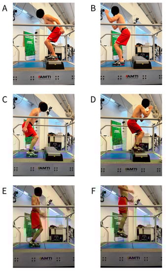 An example of a participant performing each of the jump types assayed. Panels (A,B) show the initial (take-off phase) and final (landing phase) phases of the drop jumps, respectively, while Panels (C,D) show the initial and final phases of the box jumps, respectively, and Panels (E,F) show the initial and final phases of the continuous jumps, respectively.