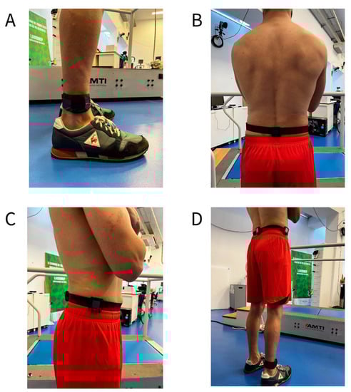 Accelerometers’ positioning on the body: Details of accelerometer positioning on the ankle, lower back, and hip are displayed in Panels (A–C), respectively. Panel (D) shows all accelerometer placements simultaneously.