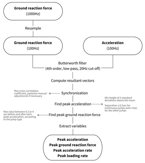 A flowchart showing the steps of the data processing can be seen in Figure 4. MATLAB software (Version 2019a, MathWorks, Natick, MA, USA) was used to process the data from both the force plates and the accelerometers. Data were processed according to the following procedures: First, the ground reaction force signal from the force plate (1000 Hz) was resampled to match the activity monitors’ sampling frequency (100 Hz). Then, both the ground reaction force and acceleration signals were filtered using a Butterworth fourth-order low-pass filter, with a 20 Hz cutoff frequency, to attenuate the noise. This cutoff frequency was selected based on visual inspection of the signals’ frequency spectra after a fast Fourier transform (FFT). Afterwards, the ground reaction force and acceleration’s resultant vector was calculated (). After that, both signals were adjusted using the time set by the system’s clock and then synchronized by the maximum cross-correlation coefficient. Then, the ground reaction force and acceleration signals were visually inspected, and whenever their peaks were not in the same hundredth of a second, manual adjustments to the synchronization were performed. An example of the ground reaction force and acceleration signals for each jump type can be observed in Figure 5. Next, the peak acceleration (pACC) was determined by the following criteria: (i) a minimum magnitude of three standard deviations above the mean acceleration value recorded during a trial, and (ii) a separation of at least 0.2 s for continuous jumps and 4 s for the other jumps. Then, pGRF was defined as the highest value within +/− 0.2 (continuous jumps) or +/− 4 (drop and box jumps) seconds of each pACC, according to the jump type. The rates of change were computed through a centered derivative from the beginning of the foot contact to the curve peak (Equation (1)). The pLR and peak acceleration rate (pAR) were defined as the maximum value in the array derived from Equation (1) and represented by in Equation (2).