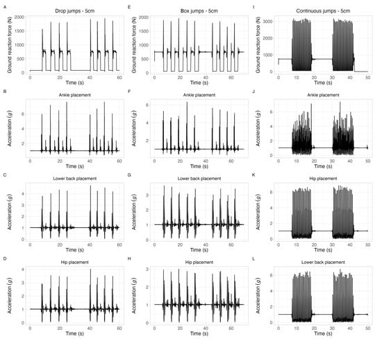 Examples of the ground reaction force and acceleration signals for all of the jump types performed. The first column, formed by Panels (A–D), shows the ground reaction force and acceleration signal for accelerometers at the ankle, lower back, and hip for the drop jump from 5 cm height. Panels (E–H) show the same signals, but for the box jumps of 5 cm height, while Panels (I–L) show the signals for the continuous jumps of 5 cm.