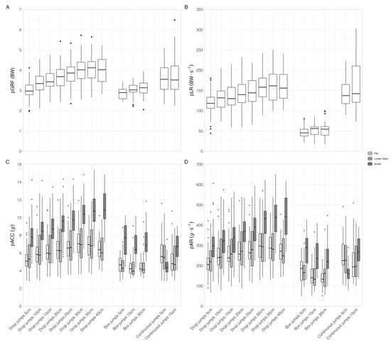 In our protocol, three distinct jump types were performed, each using several different heights. This variety of jumping trials produced a considerable heterogeneity in the response of both the force-plate- and accelerometer-measured variables. The results obtained for pGRF, pLR, pACC, and pAR, with respect to their resultant vectors, can be observed in Figure 6 (see Supplementary Figure S1 for the vertical vector).
