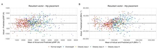To visualize the agreement between the pGRF and pLR values measured by the force plates and predicted by the models, a series of Bland–Altman plots were built for both the resultant and vertical vectors and for all accelerometer placements. Figure 7 shows the Bland–Altman plots for the resultant pGRF (panel A) and pLR (panel B) vectors of the hip-worn accelerometers. Both plots show good agreement levels, as at least 94% of the data points are within the limits of agreement and the data tend to cluster around zero. Bland–Altman plots for the other accelerometer placements and vectors also showed the same previously described patterns and can be found in Supplementary Figure S2 for pGRF and in Supplementary Figure S3 for pLR. Moreover, as could be observed from the results of the one-sample t-tests, none of the equations presented a bias significantly different from zero (p > 0.05). Furthermore, all of the equations showed a proportional bias, i.e., the magnitude of the values influences the prediction error. However, as the linear regressions used to assess the proportional bias presented a very small R2 (maximum value of 0.10), this effect is negligible.