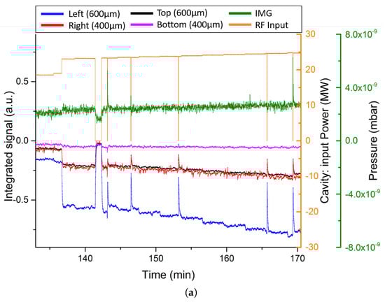 where is the load, is the measured signal within a time period , is the offset value of the detector when no signal is present, and K is a calibration constant, whose main contributions encompass the solid collection angle of the fibre, the fibre positioning, and the detection efficiency. In this case, K was not calculated, and the relative signal strengths and timings were compared. This integrated signal was collected over the course of RF conditioning. Figure 13 presents the results. The four fibre signals are shown along with the RF input power in orange and the cavity pressure in green. Several details are of note. First, each fibre saw a different signal intensity, but all fibres saw the same signal features, indicating once again the difference that can be produced by different fibre placement and core diameter. Second, as the input RF power was slowly ramped upwards in the RF conditioning process, so too did the integrated signal on all four fibres. This agrees with the earlier instantaneous output results; as the power increases, so does the field emission. Finally, where as Figure 13a presents a period of RF conditioning where the input power was ramped up and no RF breakdowns occurred, Figure 13b shows two RF breakdown events. These are evident where the RF input power is still being applied, yet the IMG pressure reading has spiked. This occurs at a high intensity at 463 min and a low intensity at 471 min. In both instances, all four optical fibres were able to detect a significant increase in Cherenkov radiation generation. Unfortunately, once again, a lack of synchronisation between the new optical fibre system and the existing diagnostics was not possible, so a high resolution comparison of the onset times of these spikes was not possible at this time. There is however a clear corroboration between the existing diagnostics and the optical fibre system. Figure 13b also demonstrates additional features in the Cherenkov signal ahead of the breakdown spike, common amongst all four fibres. Further investigation of these artefacts may lead to novel RF breakdown prediction features.