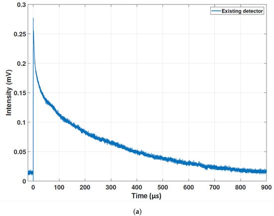 The response to a 5 ns laser pulse in the existing system (a) and the new system (b).