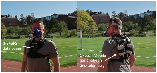 Twelve recreational runners (age 30.9 ± 8.7 yrs, height 176.9 ± 8.9 cm, body mass 78.3 ± 13.0 kg, body mass index 24.9 ± 3.1 kg/m, nine males) with varying fitness levels participated in the field tests on a level outdoor track. All participants were healthy and trained, according to their own statements, on average two times per week. The Ethics Committee of Tampere Region approved the study. The participants gave informed consent, and the research was conducted in accordance with the WMA Declaration of Helsinki []. After arriving at the track and providing consent, the participants were equipped with the chest mounted INS/GPS device, oxygen mask, gas analyzers and telemetry radios from Oxycon Mobile and, in some cases, a heart rate monitor’s chest strap. The setup is shown in Figure 1. Participants were instructed to walk or run on the outdoor track at speeds ranging between 1.3 and 3.5 m/s. The speed was chosen subjectively based on the participant’s own feeling of fast and slow pace.