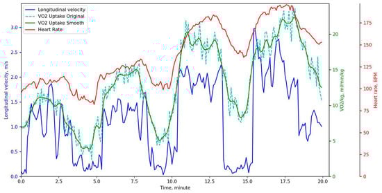 measurements and respiratory frequency were collected using breath-by-breath methods from a portable spirometer (Oxycon Mobile, Jaeger, Würzburg, Germany) every 5 s. Immediately before every test session, the gas analyzer and the flow meter were calibrated. The data from the Oxycon Mobile were collected on the notebook using provided telemetry. The accuracy of Oxycon Mobile was discussed in []. According to the authors of this study, the Oxycon Mobile significantly underestimates at high workloads above 200 W. Typical bias is about 100 mL/min and standard deviation is approximately 125 mL/min. The oxygen uptake measurements were post-processed to reduce the measurement noise and remove outliers. A Savitzky-Golay filter [] with polynomial order and frame length set to 3 and 1, respectively, was applied three times on the oxygen input data (Figure 2). HR measurements were recorded continuously (beat-by-beat) during the test with a Suunto Movesense IMU+HR system with an output rate of approximately 1 Hz. It was also smoothed and interpolated after the tests.