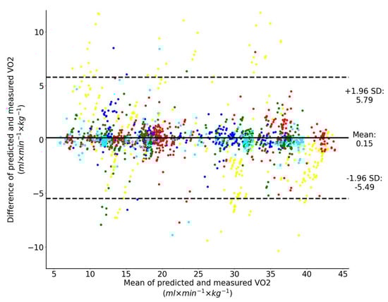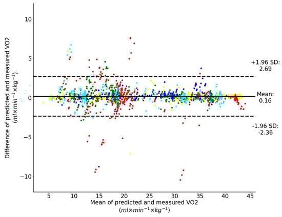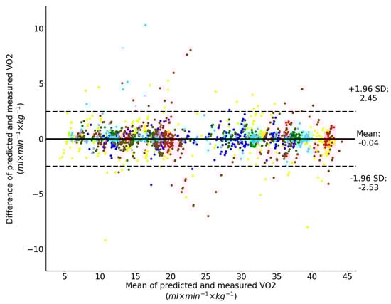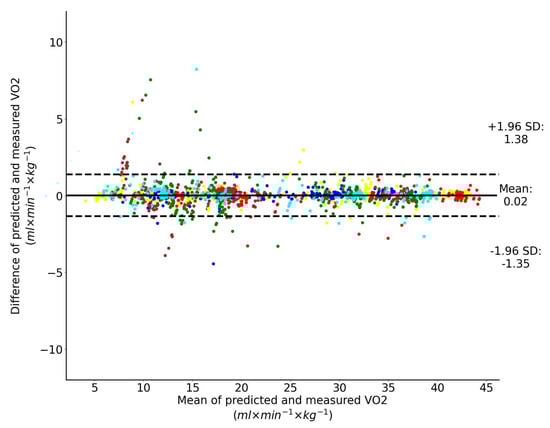 Bland–Altman analysis of the predicted and directly measured oxygen uptake with all exercise conditions combined. The inputs to the LSTM network include four motion features. Dashed horizontal lines represent the 95% limits of agreement and the solid line represents the prediction bias. Each color represents data from a unique participant in the test set.