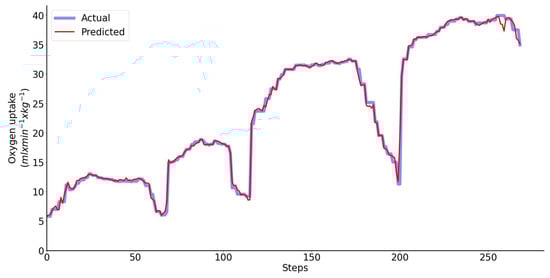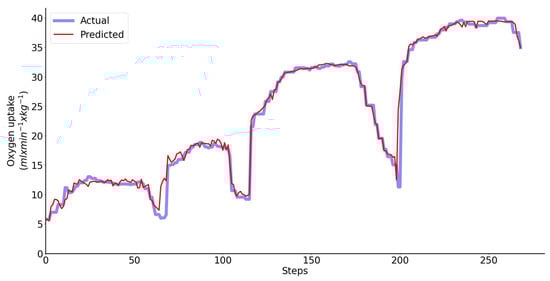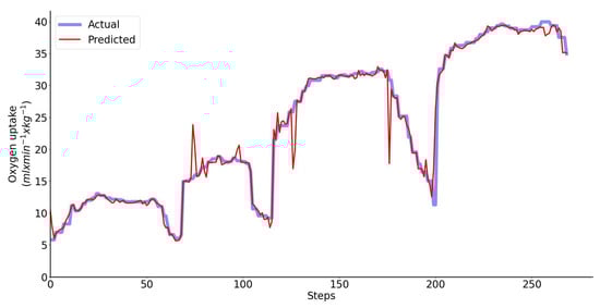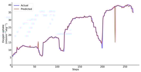 As our LSTM model’s performance was mainly evaluated using data collected during the same session, it remains unclear how well it can perform with data collected during different days. There are many factors that can influence daily oxygen uptake during exercise, such as previous physical activity, state of health and contents and the time of previous meal. Even when these things are taken into account, day-to-day variation in oxygen consumption can be around 5% when performing exercise under a constant load []. When thinking about changes in oxygen consumption during exercise in the long run, factors such as endurance training, resistance training and nutrition can also have an effect [,].