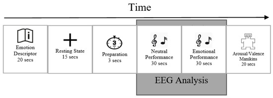 Although a vast number of studies have focused on recognition of emotions evoked by music-listening, there is limited number of studies that address the associations between the neural activities of performers and their intentionally expressed emotions while they are performing a piece [22,23]. It has been shown that brain activity during the perception of emotions induced by music-listening differs from that involved in the creative expression of emotion through music performance [24]; moreover, it is possible that music performers experience different emotions than what they are trying to express through the performance [25]. In our previous works [11,12], we demonstrated that both power and effective connectivity patterns differ when professional musicians are instructed to play distressed, excited, depressed, relaxed, or neutrally labeled music pieces.