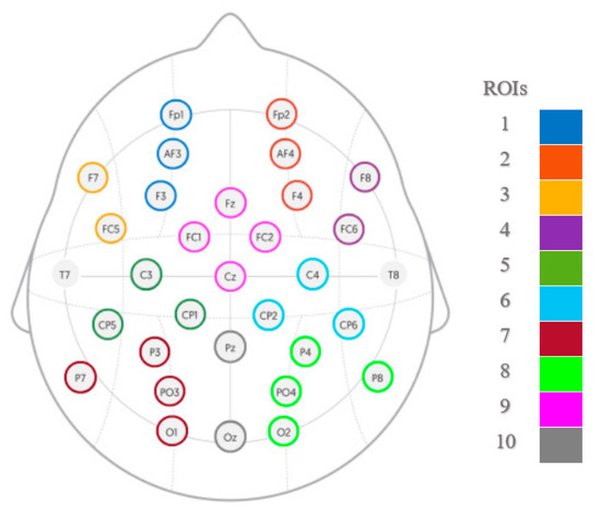 Ten regions of interest (ROI) were created according to Figure 3; electrodes within each ROI were averaged, and segments lacking information on at least one ROI (i.e., if all of the channels within that ROI have been removed during the artifact removal process) were excluded from the analysis, resulting in 314 segments retained for each emotional condition (5 × 314 segments in total). From the 30 s segments, eight 3 s non-overlapping windows were created (from 3 to 27 s) for each of the 10 ROIs. The dimensions of the final matrices were equal to 1570 × 10 × 1500 arrays. Finally, by filtering the separate rows of the matrices into different frequency bands for 1–4 Hz (delta), 4–8 Hz (theta), 8–12 Hz (alpha), 12–30 Hz (beta), and 30–45 Hz (gamma), five sub-band matrices (called observation matrices) were obtained for each emotional playing condition and corresponding neutral baseline.