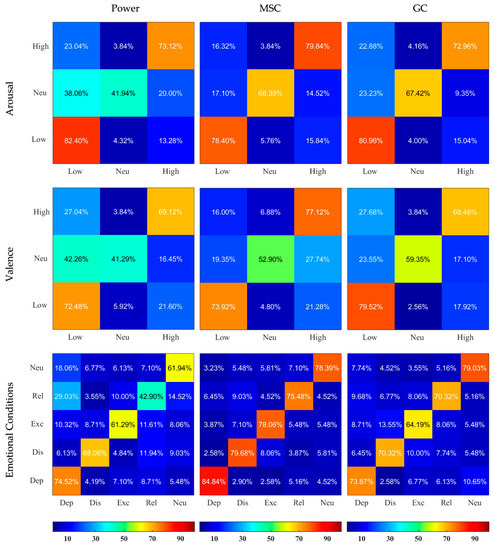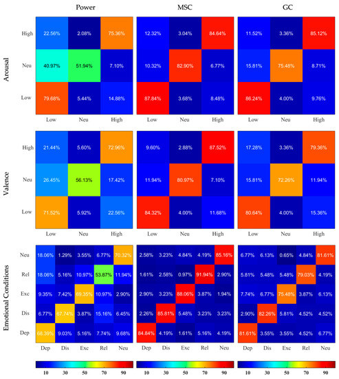 Confusion Matrices resulting from SVM classifiers applied on Normalized Power, MSC, and GC features and based on 3 different labelings. The X and Y axes represent the categories, the rows correspond to the actual class and the columns correspond to the predicted class. Dep—depressed, Dis—distressed, Exc—excited, Rel—relaxed, Neu—neutral. The predicted values are written inside the squares and are also color-coded according to the color bars provided.