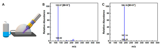 The experimental setup is shown in Figure 3A, and the LC-MS analysis of the nicotinamide (NA) sample is shown in Figure 3B. It can be seen that the main product in the collected vapor phase has an m/z of 122.94, which corresponds to a protonated NA (the molecular weight of NA is 122 g/mol). For the surface contaminated with dodecylamine (DA), the mass spectrum of the main fraction contained a dominant peak at m/z 186.13, which corresponds to a protonated DA molecule (the molecular weight of DA is 185 g/mol), as shown in Figure 3C. These observations support the assumption that desorption by LTP does not lead to the fragmentation of these substances and allows the transfer of intact analytes from surfaces to the gas phase.