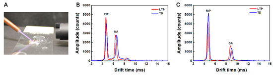Since glass is a relatively inert surface, its interaction with the sample and other benign materials that the LTP may also vaporize is weak, making it a convenient starting point for this study. During the experiments, the LTP and the IMS were positioned a few centimeters from the surface (Figure 4A). The IMS spectra (plasmagrams) were recorded in real-time at five seconds duty cycle. In a control experiment in which the glass was clean, only the background reactant ion was seen, and no product ion was observed in the plasmagram. Similar results were obtained in a different control experiment with the contaminated glass substrate without applying the high voltage or when the LTP jet was directed to a non-contaminated part of the glass substrate. Operation of LTP on a glass surface contaminated with DA or NA molecules led to clear product ion peaks in the plasmagrams, as seen in Figure 4B,C, respectively. Similar results were obtained using destructive thermal desorption, which is applicable in the case of glass surfaces. Based on the knowledge gained from the LC-MS control experiments, the palsmagrams, shown in Figure 4, are assigned to the protonated sample molecules for both LTP and TD. The good correlation between the LTP-acquired and the TD-acquired spectra indicates that the LTP is a soft method for desorption and ionization which does not lead to fragmentation of the target molecule, hence allowing the detection device to easily identify the desorbed products.