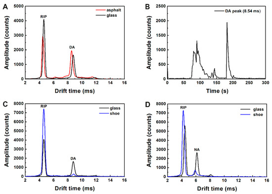 Figure 5A shows the obtained plasmagrams in the positive channel for sampling with an LTP probe from an asphalt surface contaminated with DA, compared to sampling under the same conditions from a glass surface. It can be seen that all three product ions of DA that appear in the contaminated glass sample also appear in the contaminated asphalt sample. There can be seen small shifts in the drift time of the peaks. These shifts can result from differences in water clustering around the ionized analyte, as LTP may reduce the number of available water molecules in the sampled area. Figure 5B shows the time trace of the dominant peak (drift time—8.54 ms) during a four minute operation of the LTP while scanning the surface by moving the LTP to different areas on the surface. This time trace shows that within a minute of the scan, the jet reached the contaminated area, and a signal was observed for prolonged periods of 10 s between several contaminated areas on the interrogated surface. This behavior differs from what is common when working with swab samples and thermal desorption, where a single spectrum represents the entire surface sampled with a swab. This example demonstrates the potential of LTP sampling to serve both as a non-contact and a continuous sampling method, both features presenting significant advantages over the current surface sampling mode of operation. The scan option is desirable for applications such as seeking local contaminations, for example, cargo sampling, where such a continuous spatial scan reduces the chance of false negative events originating from, e.g., areas inaccessible for conventional swabs (grooves, etc.). Additional tests for other surfaces were performed; Figure 5C,D shows the results obtained in the case of contaminated shoe surfaces. For both compounds, the product ion signals are acquired with good agreement with those acquired from a glass surface.