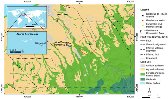 Land-use map (based on [37] and the geographic location of the Ribeira Grande geothermal field) with the existing geothermal wells (based on the studies of [23,38,39]), the main fumarolic emissions [35], and fault type (based on [40]).